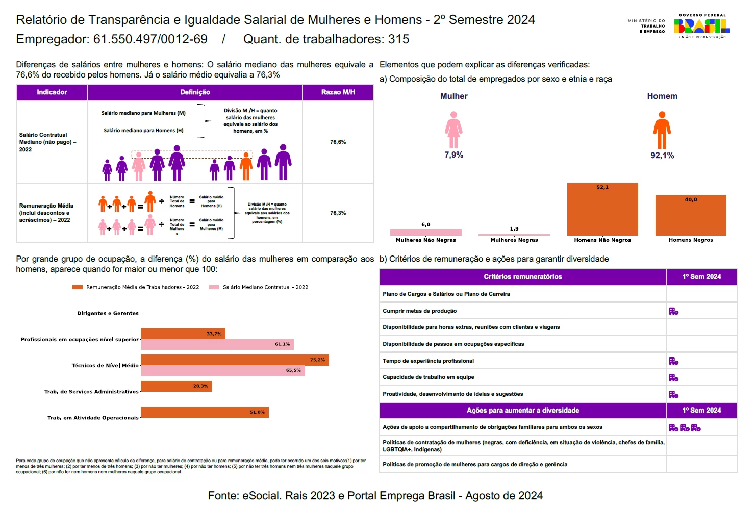 O Relatório de Transparência Salarial e de Critérios Remuneratórios disponibilizado pelo Ministério do Trabalho e Emprego, tem como objetivo dar visibilidade aos dados gerais e demonstrar a relação entre salários, remunerações e a composição do total de empregados por sexo e raça/etnia. Desse modo, expõe as informações de forma mais simplificada e genérica, a fim de permitir à população uma análise comparativa, mais objetiva.